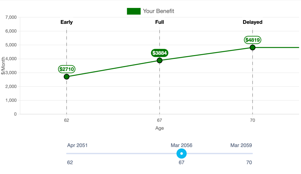 Once you do, it will give you projects based on your amount of reported earnings each year what your expected social security payments will be, whether that’s early, normal, or late. Here’s mine: